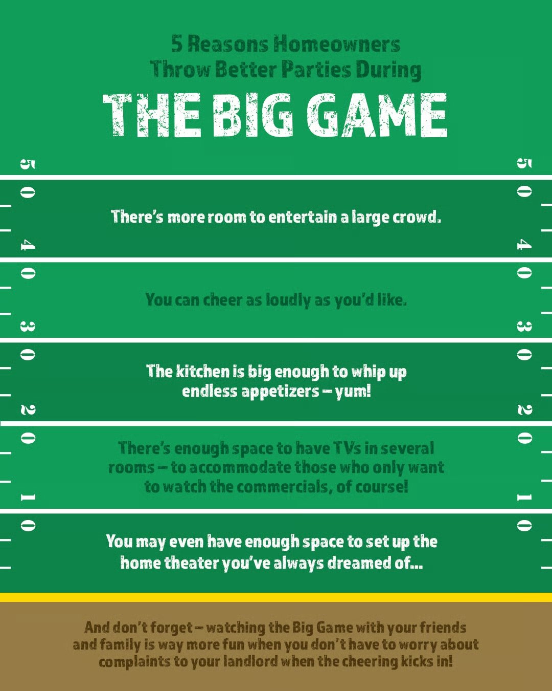 There’s more room to entertain a large crowd. The kitchen is big enough to whip up endless appetizers – yum! You don’t have to worry about complaints to your landlord when the cheering kicks in!