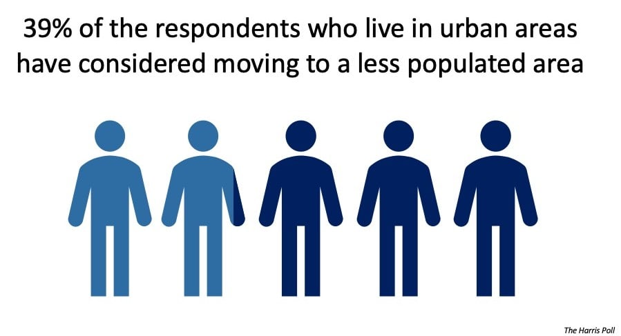 The Harris Poll recently surveyed 2,000 Americans, and 39% of the respondents who live in urban areas indicated the COVID-19 crisis has caused them to consider moving to a less populated area.