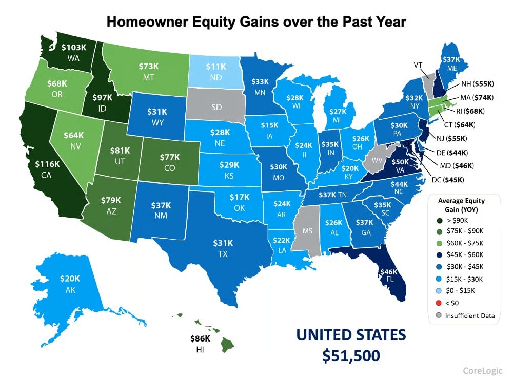 To give you an idea of what that looks like in your area, the map below shows the average equity gains by state.