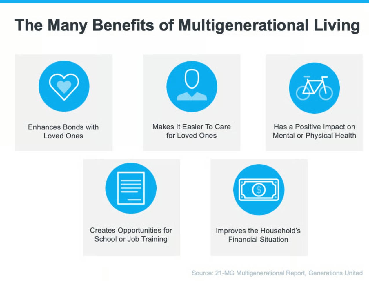 A recent report from Generations United surveyed individuals living in a multigenerational setting and asked them about the key benefits of this housing arrangement. It says: