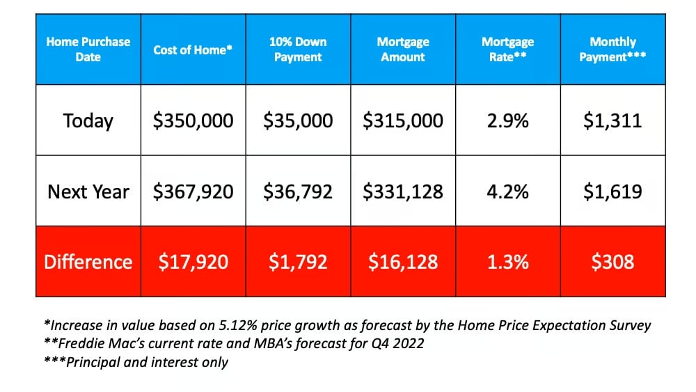 By waiting until next year, you’d potentially pay more for the home, need a larger down payment, pay a higher mortgage rate, and pay an additional $3,696 each year over the life of the mortgage.