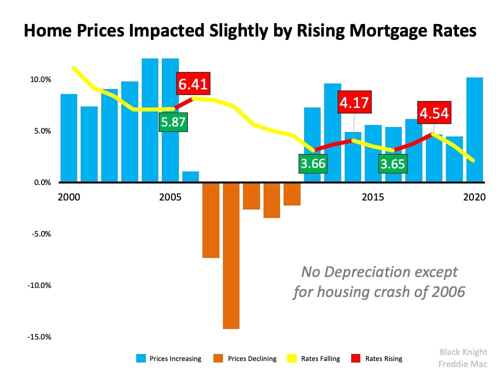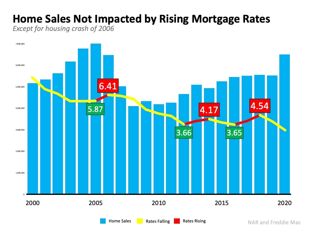 To counteract those headlines, we need to take a look at what history tells us. Looking at data over the last 20 years, there’s no evidence that an increase in rates dramatically forces sales to come to a halt. Nor does home price appreciation come to a screeching stop.