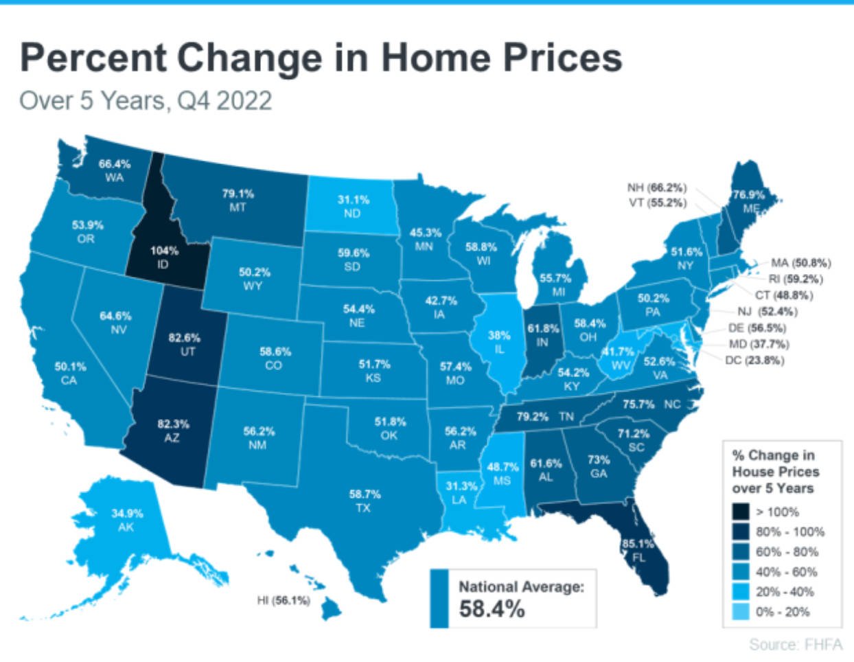 While that’s the national number, if you want to know what happened in your area, look at the map below from the Federal Housing Finance Agency (FHFA). It shows on average how much home prices have risen over the past five years, which has been a major driver behind equity growth.