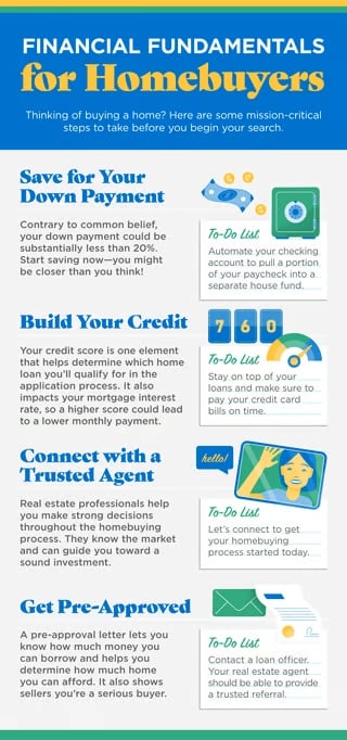 From saving for your down payment to getting pre-approved for a mortgage, you’ll want to make sure you keep your financial plan on track from the beginning.