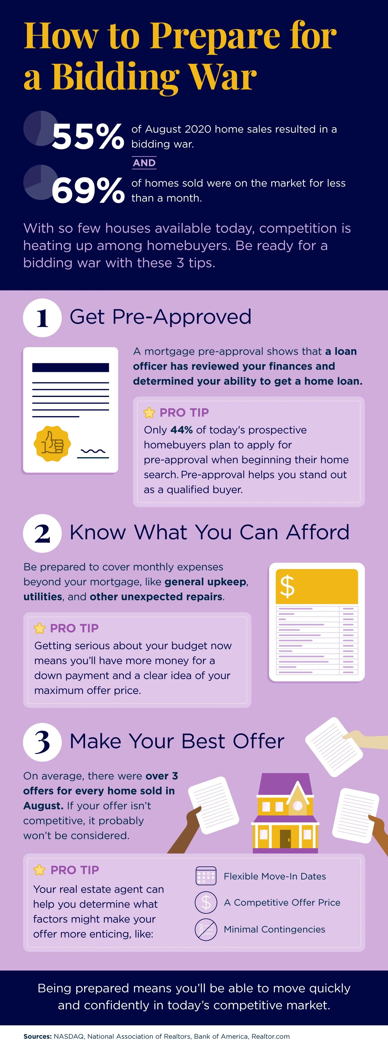 With so few houses available on the market today, being ready for a bidding war is essential for prospective homebuyers.