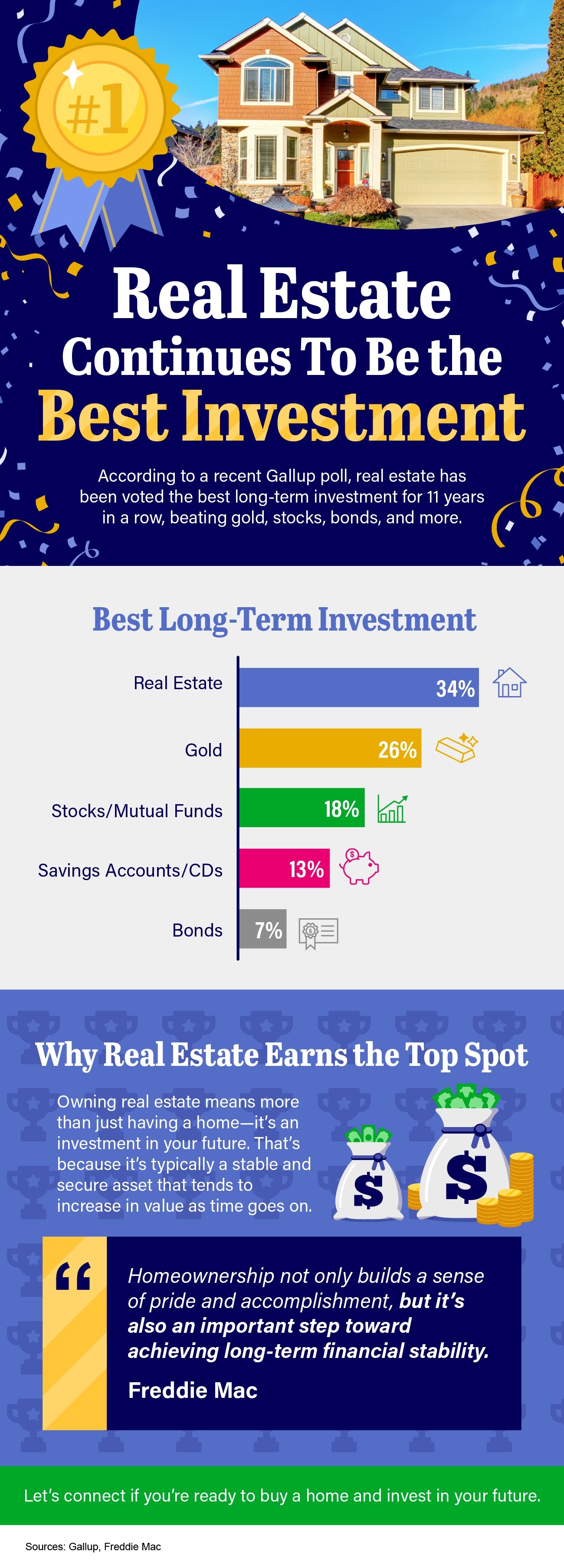 According to a recent Gallup poll, real estate has been voted the best long-term investment for 11 years in a row, beating out gold, stocks, bonds, and more.
