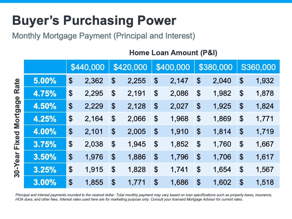 This is important to note because any increase in mortgage rates changes what a purchaser can afford. To give you an idea of how rising mortgage rates impact your purchasing power, see the table below: