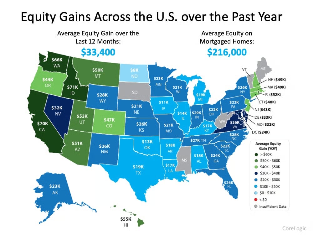 According to CoreLogic, on average, homeowners gained $33,400 in equity over the last 12 months, and the average equity on mortgaged homes is now $216,000 (see map below):