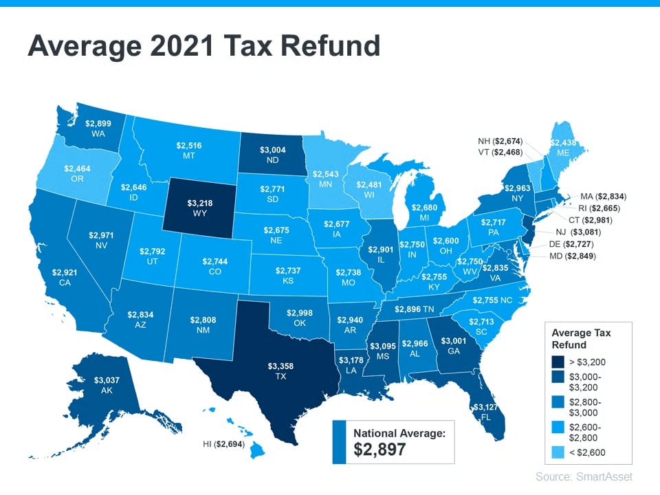 Using a tax refund is a common tactic for buyers and sellers. SmartAsset estimates the average American will receive a $2,897 tax refund this year. The map below provides a more detailed estimate by state: