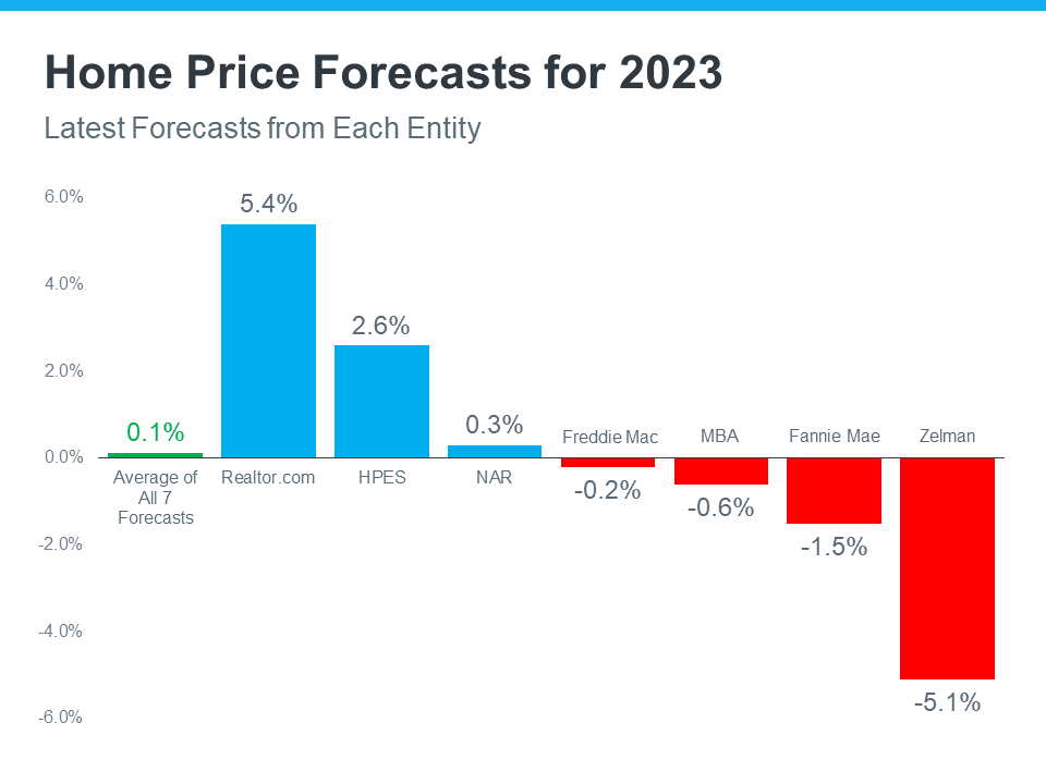 But do experts think that will continue? The graph below shows the latest home price forecasts for 2023. As the different colored bars indicate, some experts are saying home prices will appreciate next year, and others are saying home prices will come down. But again, if we take the average of all the forecasts (shown in green), we can get a feel for what 2023 may hold.