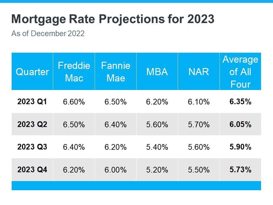 Right now, experts are factoring all of this into their mortgage rate forecasts for next year. And if we average those forecasts together, experts say we can expect rates to stabilize a bit more in 2023. Whether that’s between 5.5% and 6.5%, it’s hard for experts to say exactly where they’ll land. But based on the average of their projections, a more predictable rate is likely ahead (see chart below):