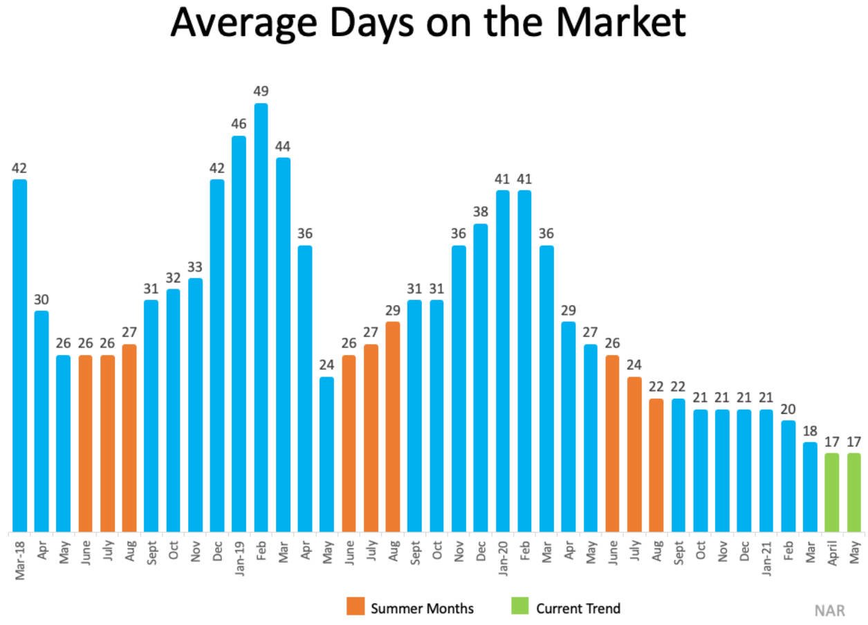Unlike the typical summer trend, time on the market is moving at the fastest speed we’ve seen since NAR started collecting this survey-based information in 2011. The most recent REALTORS® Confidence Index shows that the average home is on the market for just 17 days, as shown in green in the graph below.
