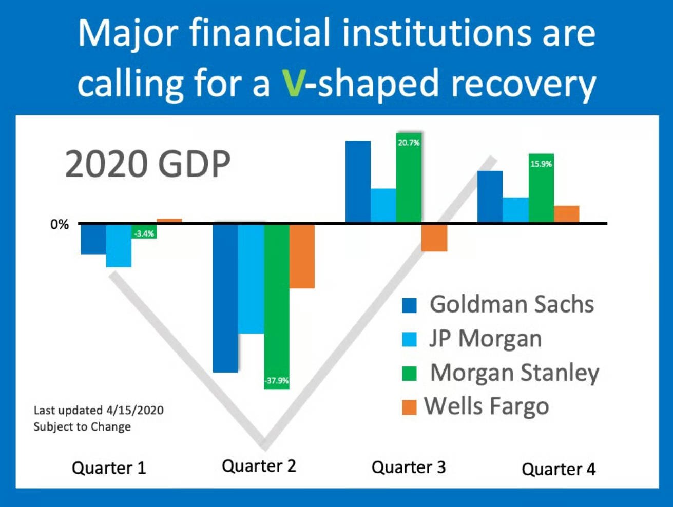 No one can answer this question with one hundred percent certainty. However, most top financial services firms are calling for a V-shaped recovery. Goldman Sachs, Morgan Stanley, Wells Fargo Securities, and JP Morgan have all recently come out with projections that call for GDP to take a deep dive in the first half of the year but have a strong comeback in the second half.